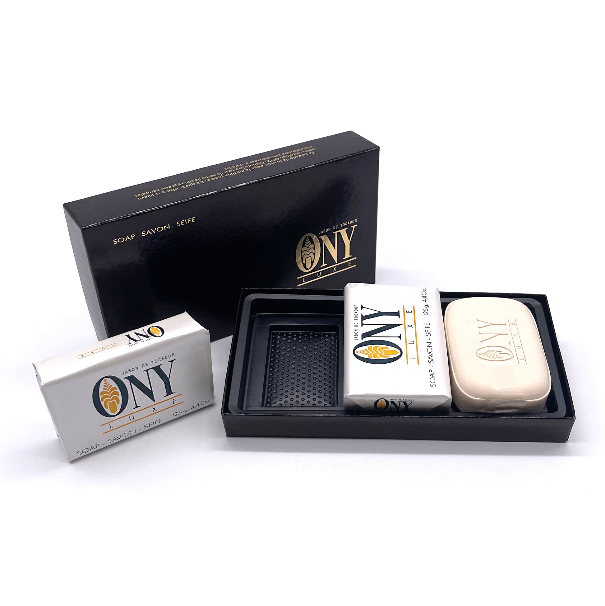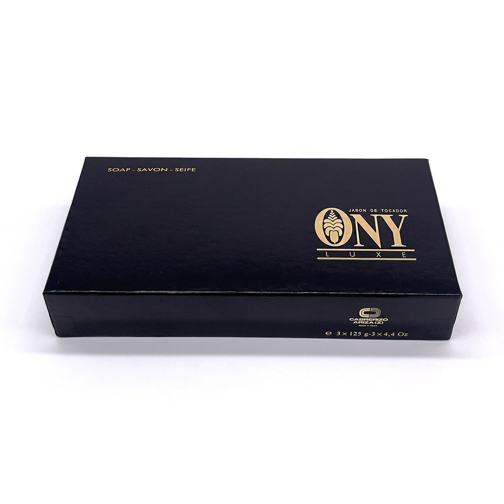 Estuche de cartón forrado con 3 pastillas de jabón Ony, otro clásico de la marca zaragozana Jabones Cabrerizo.