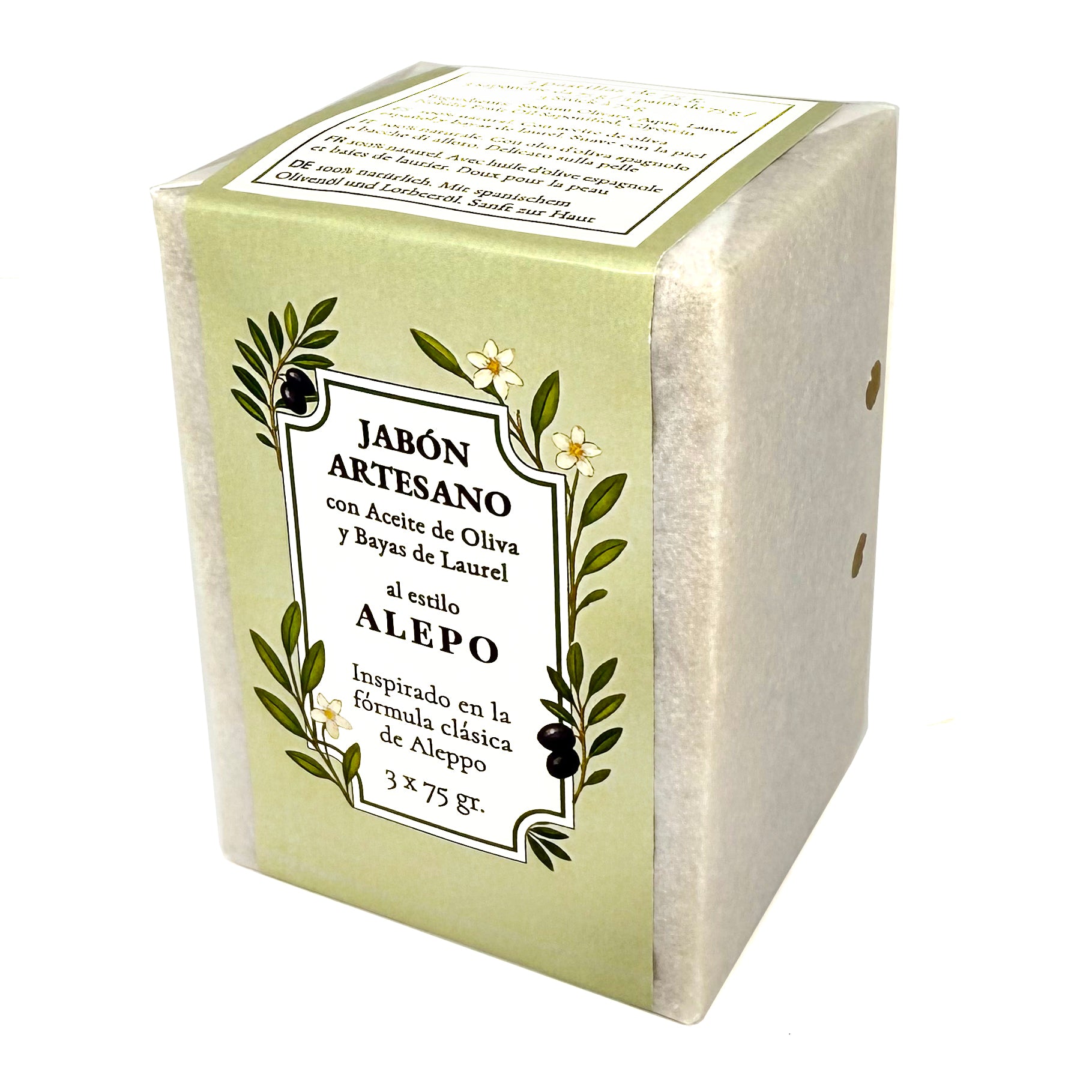 Jabón de Alepo Natural · 3 Jabones Artesanales de Alepo y Aceite de Oliva · 3 pastillas de jabón 75 gr.
