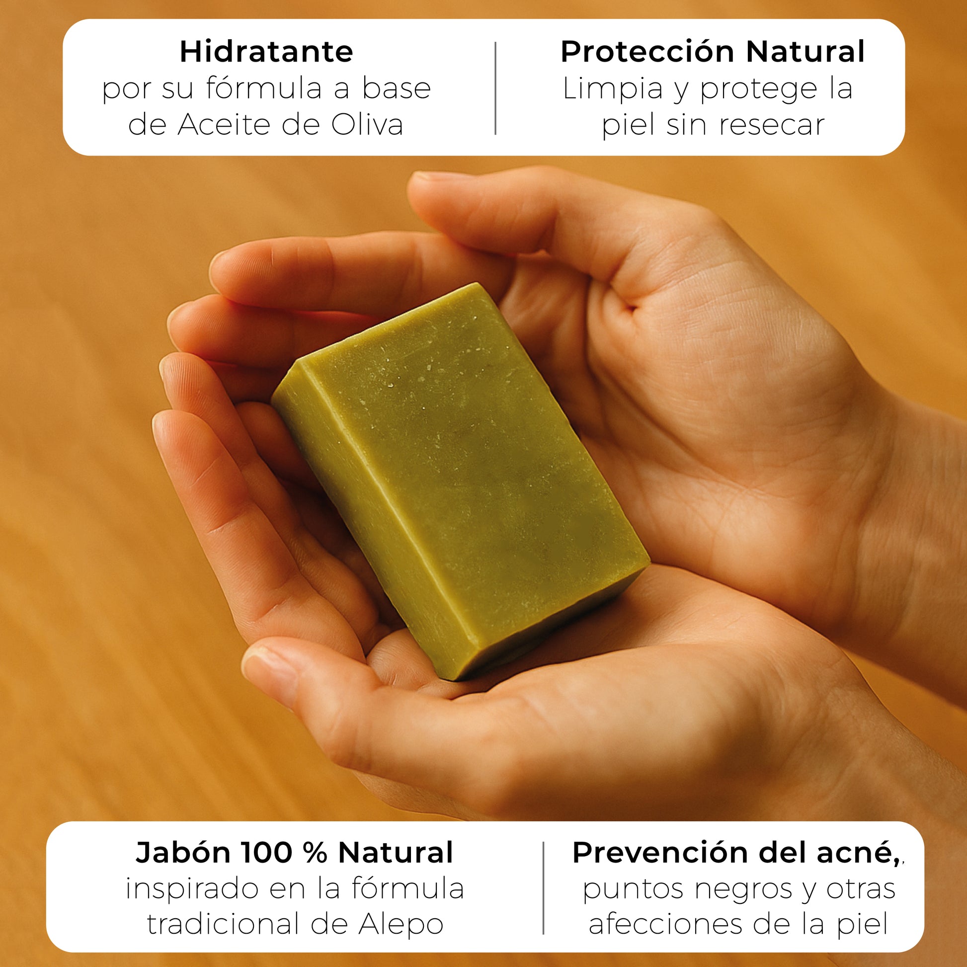 - JABON ALEPO NATURAL Y ARTESANO – HIDRATACIÓN Y CUIDADO DE LA PIEL: Jabón natural sin químicos (100% natural), inspirado en la fórmula clásica de Aleppo: aceite de oliva español y bayas de laurel. Nutre, limpia y protege la piel sin resecar. Especialmente indicado como jabón facial, corporal y de manos.